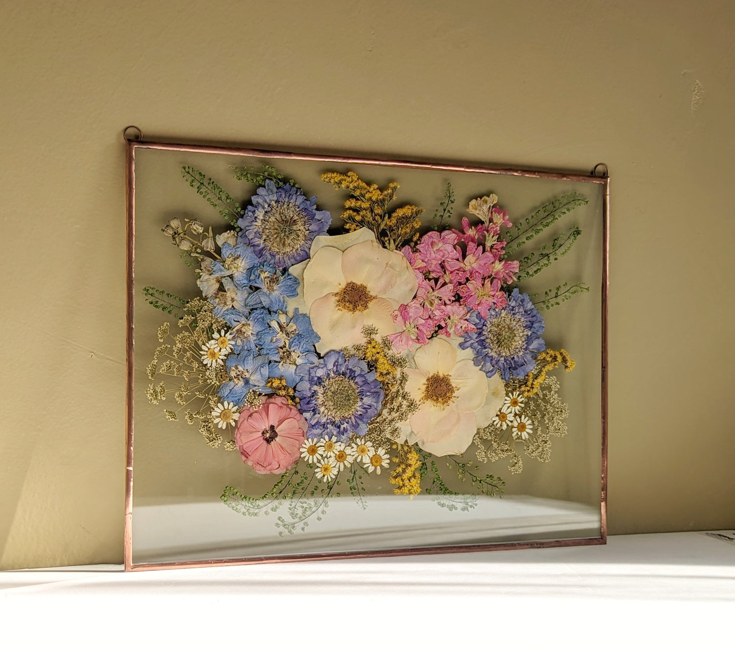 Our framed florals are truly one-of-a-kind. Starting as fresh flowers, they're carefully pressed over weeks before being arranged by hand with stained glass to create stunning works of natural art. Each piece is a testament to the beauty of nature and the skill of our artisan, Lindsey.